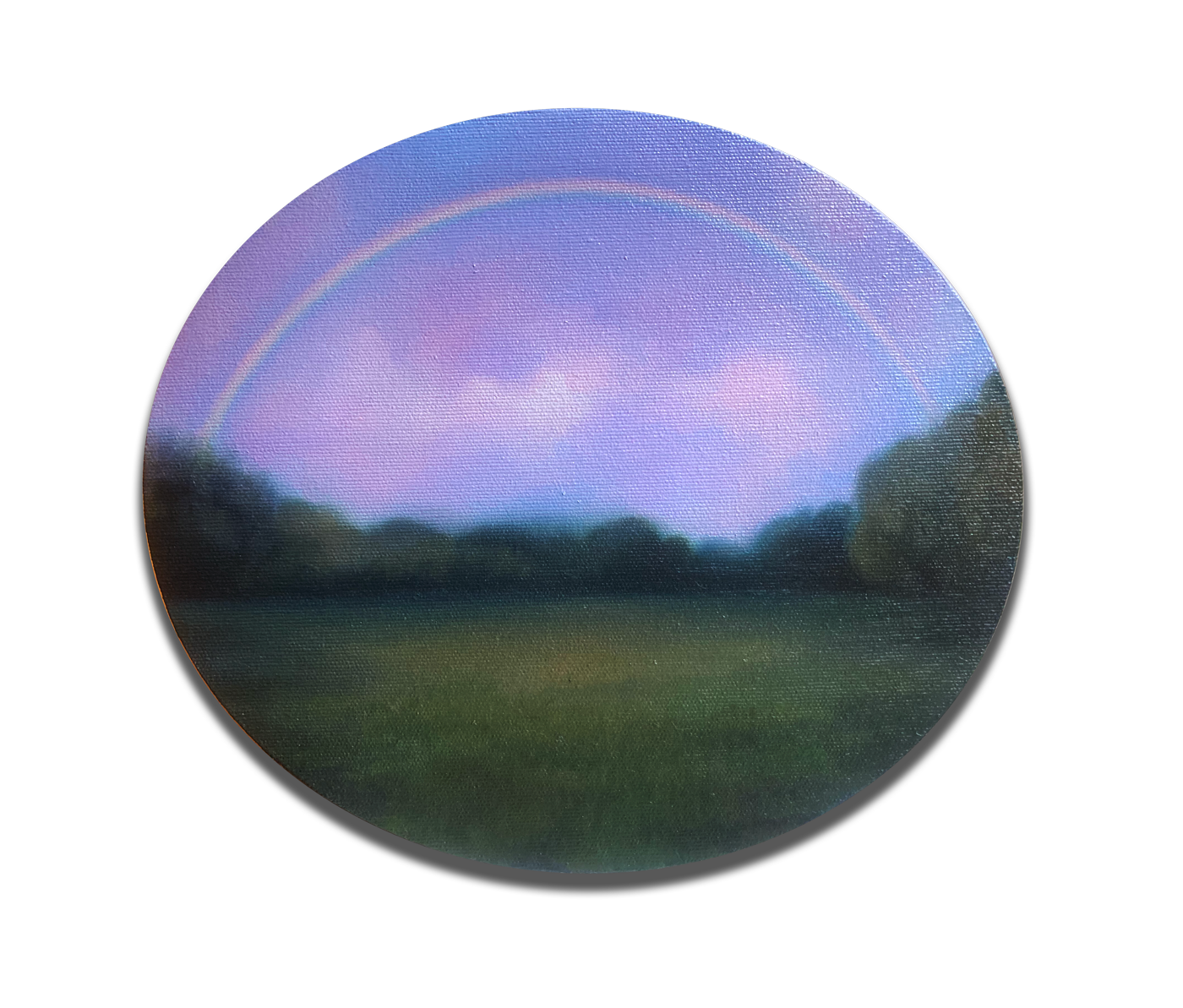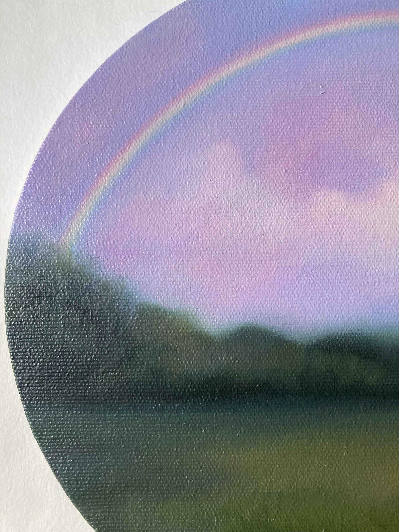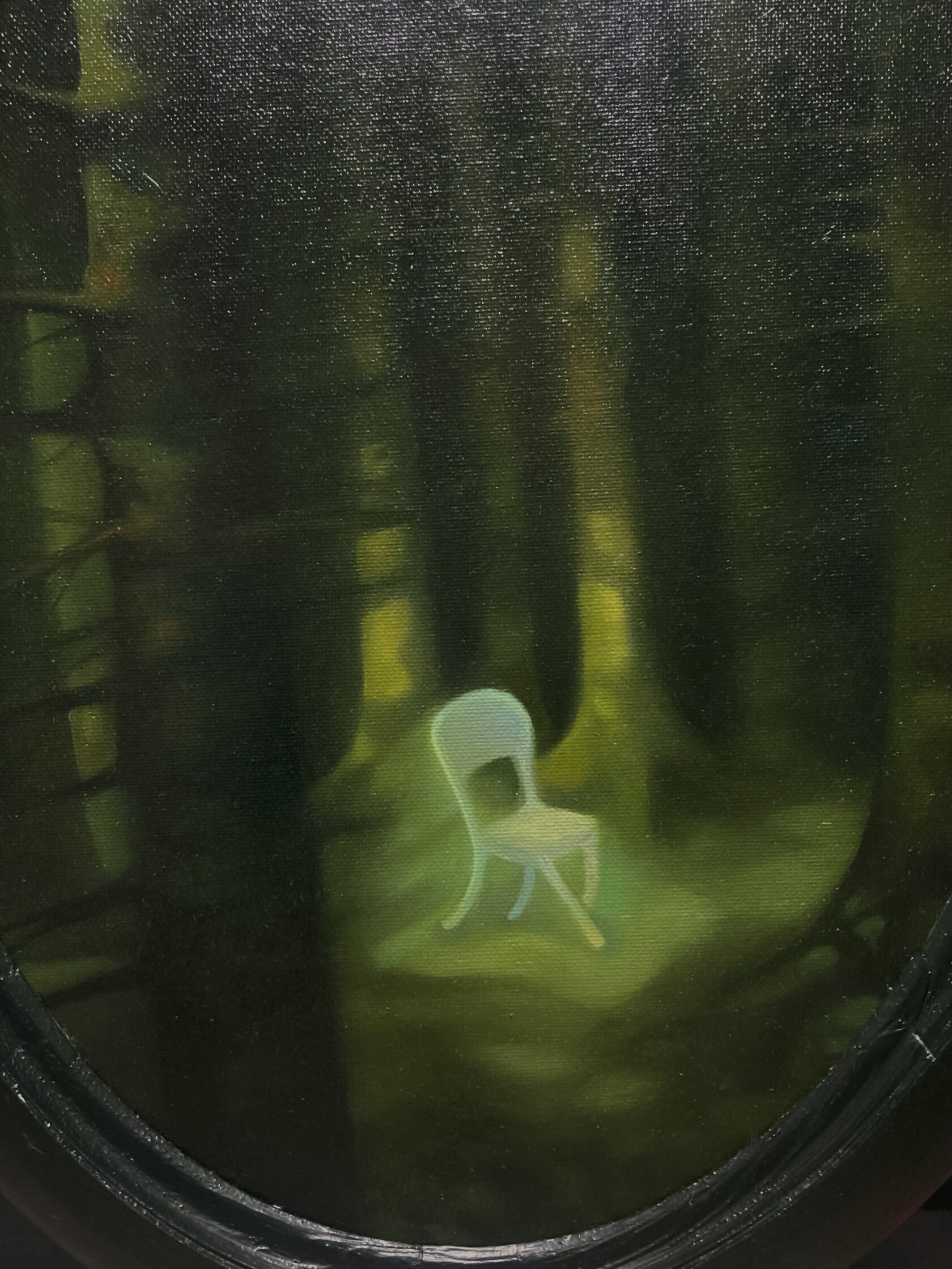 Этот триптих был создан в чуть позже – в 2022 году, и пока нигде не экспонировался. Я опиралась на тексты, исследующие тему “ведьминых кругов” со всех возможных точек зрения, особо выделяя символизм, и психологические состояния/ощущения от столкновения с неизвестным/паранормальным/странным/ прекрасным и пугающим. С помощью живописи я стремлюсь уловить и передать эфемерное ощущение жуткого и тревожного, того самого unheimlich, которое возникает от совокупности атмосферных явлений, странных объектов, природных аномалий. Перед вами сцены-кадры, вырванные из потока сознания, связанные общим потусторонним и мистическим лором. Круги как форма, круг как граница и магический круг как портал в иной мир + сияние тайного, неизведанного, сквозь зыбкий туман иллюзий.
