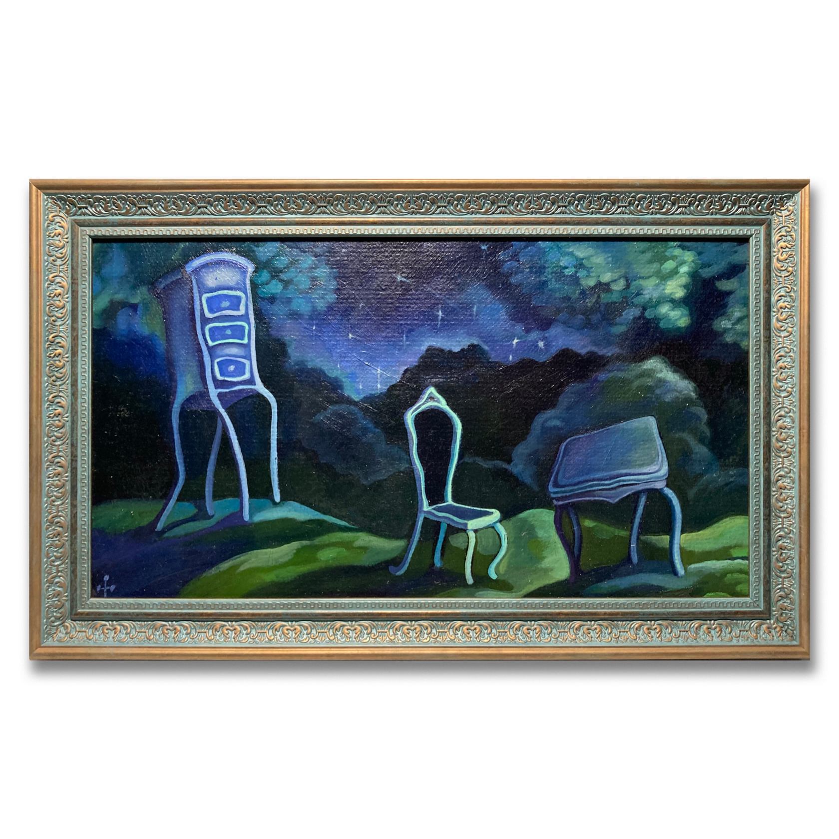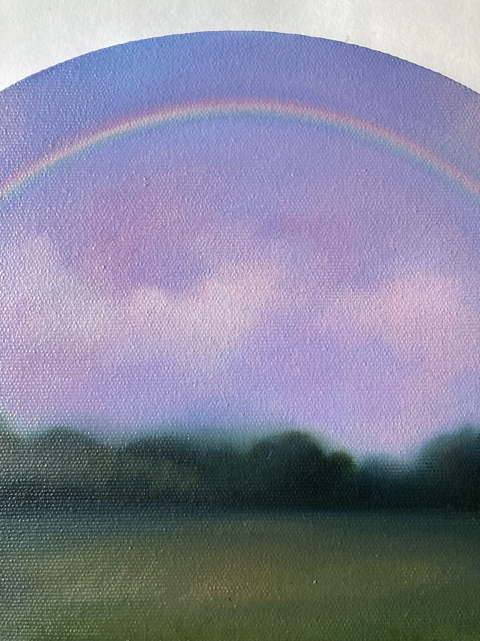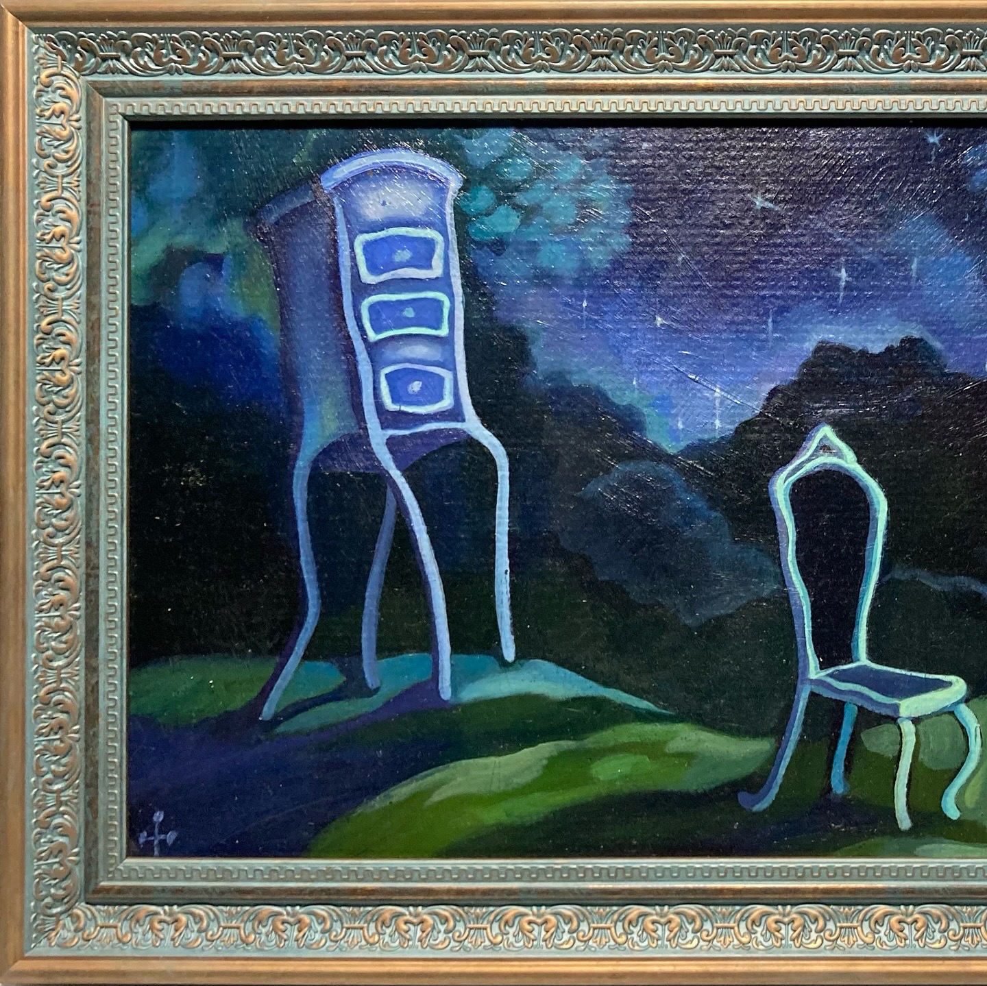 Этот триптих был создан в чуть позже – в 2022 году, и пока нигде не экспонировался. Я опиралась на тексты, исследующие тему “ведьминых кругов” со всех возможных точек зрения, особо выделяя символизм, и психологические состояния/ощущения от столкновения с неизвестным/паранормальным/странным/ прекрасным и пугающим. С помощью живописи я стремлюсь уловить и передать эфемерное ощущение жуткого и тревожного, того самого unheimlich, которое возникает от совокупности атмосферных явлений, странных объектов, природных аномалий. Перед вами сцены-кадры, вырванные из потока сознания, связанные общим потусторонним и мистическим лором. Круги как форма, круг как граница и магический круг как портал в иной мир + сияние тайного, неизведанного, сквозь зыбкий туман иллюзий.